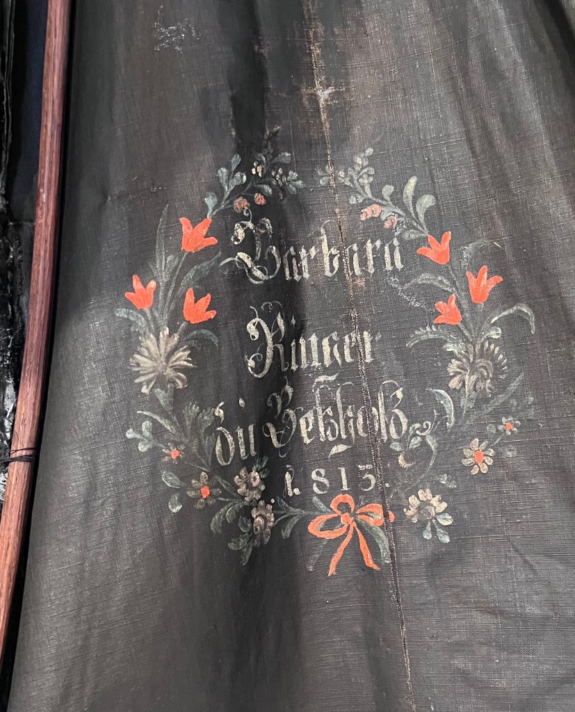 Der Regenschirm etabliert sich zu Beginn des 19. Jahrhunderts in der Gesellschaft. Bis dahin war das einfache Volk dem Wetter ausgesetzt. Hier also ein Schirm aus der Anfangszeit (1813), der dem Gründer des Ortsmuseums, Henri Feurer, zufolge, aus einer Schutthalde gerettet wurde. Ab 1850 erst wurden Regenschirme dank technischer Innovationen zum Alltagsbegleiter. Dieser hier war mit einem Durchmesser von 1.4m nicht nur gross, sondern auch ein Schwergewicht, was Feurer dazu veranlasste, augenzwinkernd anzumerken, dass sich hoffentlich bald ein Kavalier fand, der Barbara Ringer diesen Schirm trug.